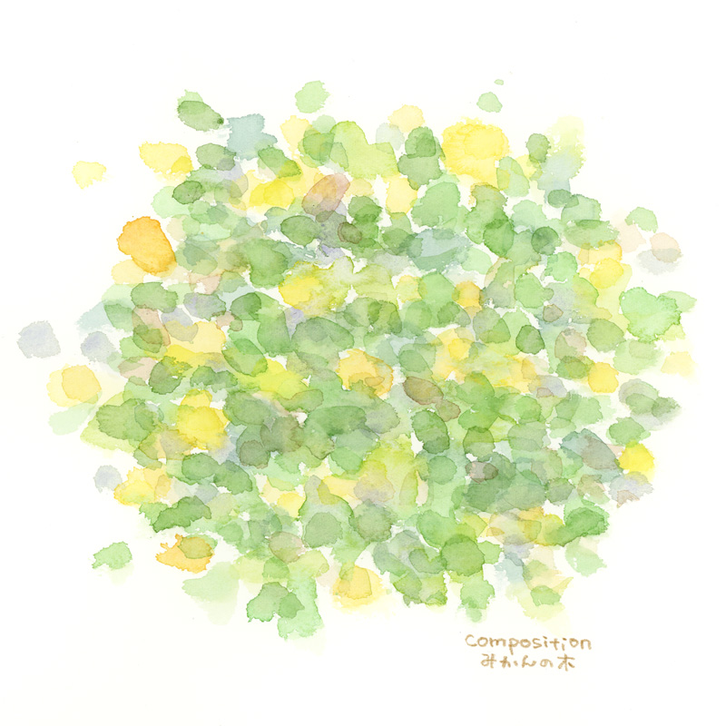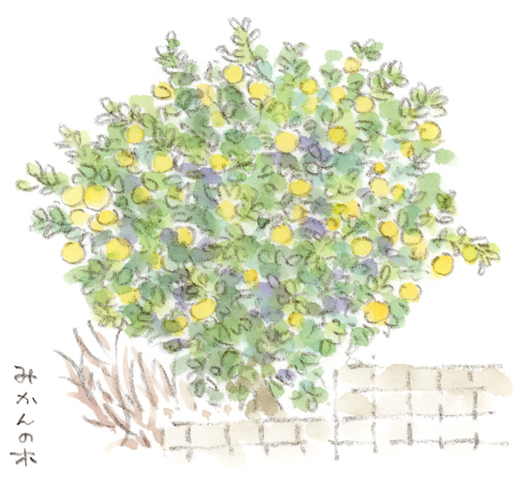 (先日色彩スケッチした)ミカンの木。ひとつ15センチくらいある大きなミカンが、たわわにぶら下がっている風景は、なんだか和みます。すごく茂っていて、中はどうなってるんでしょうね。葉っぱだらけ??小鳥たちはこういうところで雨風をしのいで過ごすのかな?いろいろ想像が膨らみます。