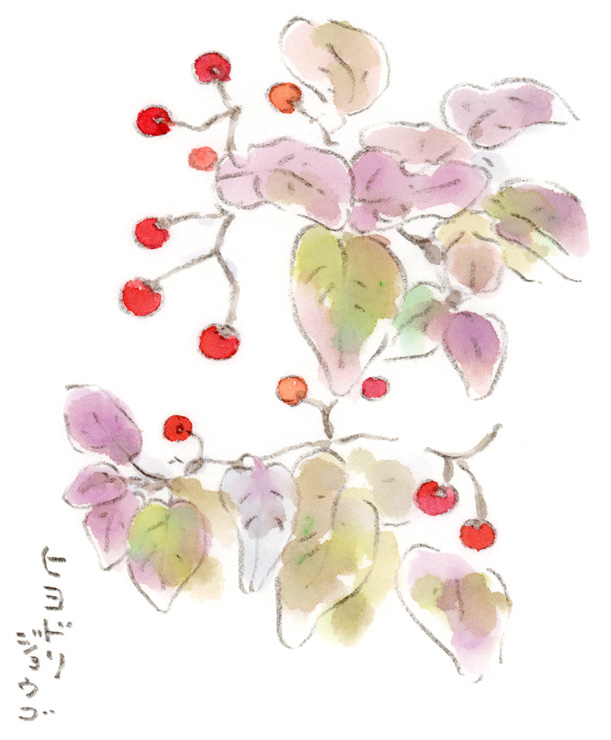 四谷の緑道にて。ヒヨドリジョウゴの実を見つけました。このヒヨドリジョウゴは、ナスっぽい紫色に紅葉していて幻想的な雰囲気でした。他の場所では緑の葉の株が多いので、紫色に変化するのはどういう条件が影響してるのでしょうかね。不思議です。