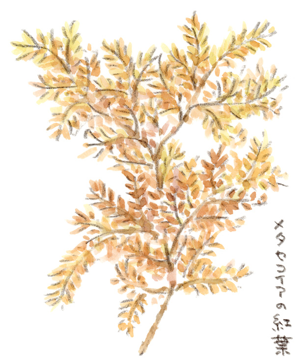 近所の公園のメタセコイヤ。落葉も大分進んでいるのですが、いくらか葉が残っていました。柔らかい羽根のような葉が黄色や赤褐色に色付いています。子どもの頃、アパートの裏庭に大きなメタセコイヤの木が植えてあって、4階に住んでいた私はベランダから眺めるのが大好きでした。三角の樹形が綺麗です。