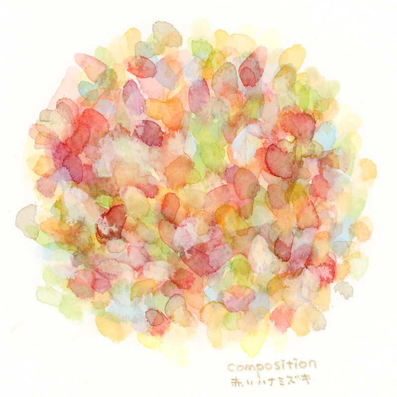 濃い紅色のハナミズキ。ハナミズキというと白かピンクのイメージですが、紅葉みたいな色でした。光に透けた赤や黄色、新芽の黄緑色などが、カラーセロファンを光に透かして見てるようです。まだ開きかけでしたので、一見葉っぱかと思いましたら、ハナミズキの花は葉に近い構造なのだそうです。(用紙-ワトソン, 透明水彩)