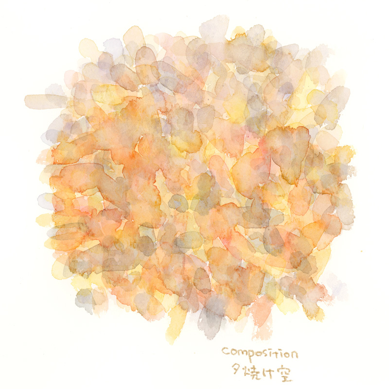 富士山の夕景を見ました。明るい黄色から柔らかいオレンジに変わる光の色。雲が作る繊細な色合い。重なりあう山々の距離によって異なる明度のシルエット。それらのグラデーションをイメージしながら描いてみました。