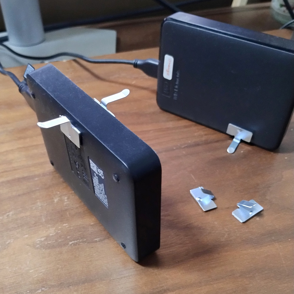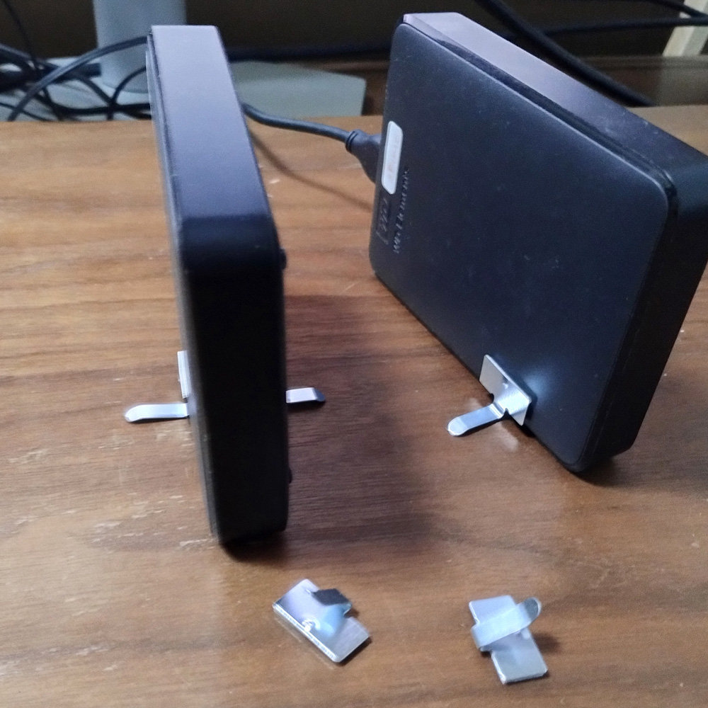 外付けハードディスクの縦置き用補助具にアルミコードフックが便利だったお話。