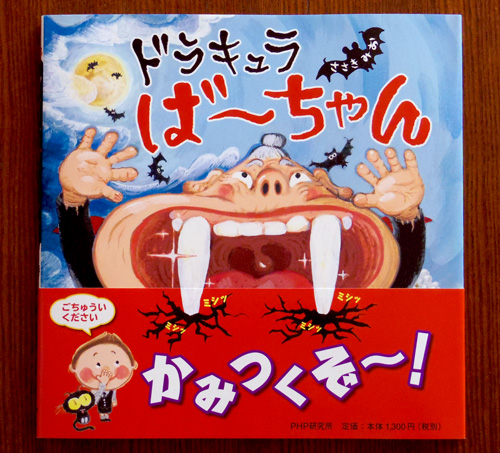 ドラキュラばーちゃんと孫っ子の微笑ましい笑い話です。表紙の帯ですが、表紙のばーちゃんの歯が突き刺さってるんです♪歯の位置を上手く印刷で合わせられるかどうか心配しましたが「案ずるより産むが易し」ですね!!ディレクションをしてくださったPHP 研究所の阿部聡子さんのGOサインで見事に形になりました!